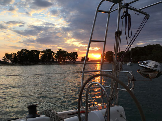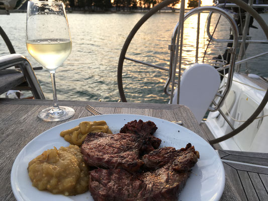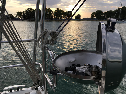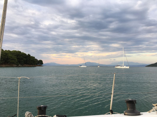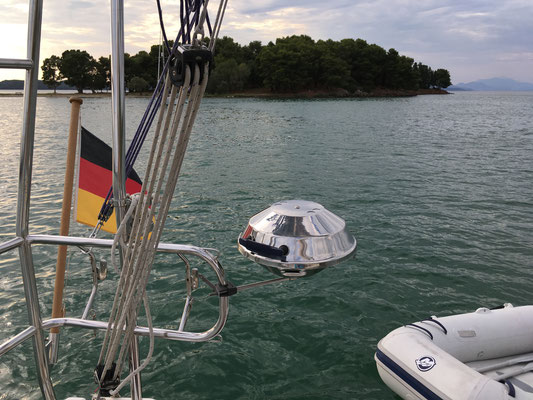 Da ich keinerlei Zeitstress mehr habe und mir vorgeniommen hatte nicht mehr so lange Stücke unterwegs zu sein, sondern eher zu chillaxen, fahre ich nach Nord-Osten in den Ambrakischen Golf. Hier ist kaum jemand unterwegs, daher soll es hier viele Delfine und Seeschildkröten geben. Ich sehe nur eine tote Schildkröte an der Wasseroberfläche treiben. In der Bucht östlich von Nisis Koukounitsa bei Vonitsa gehe ich vor Anker. Sehr gechillt hier. Wenige andere Yachten. Kein Lärm, totale Ruhe. Ich weihe meinen neuen Grill ein und genieße den Abend in der friedlichen Bucht.